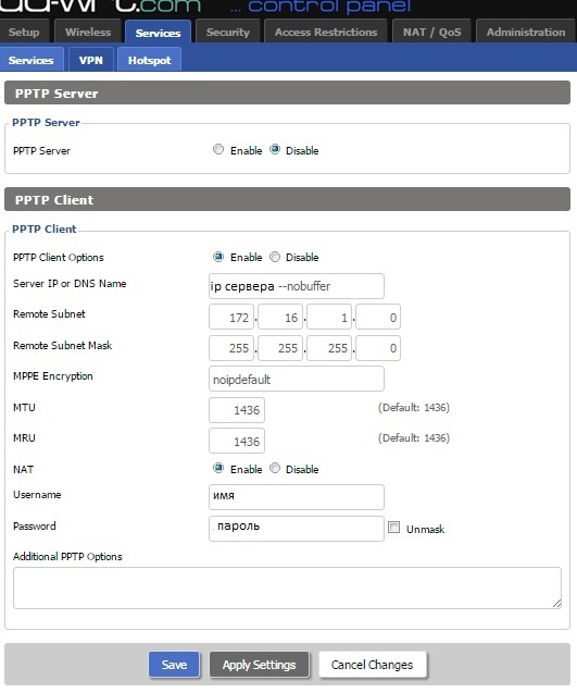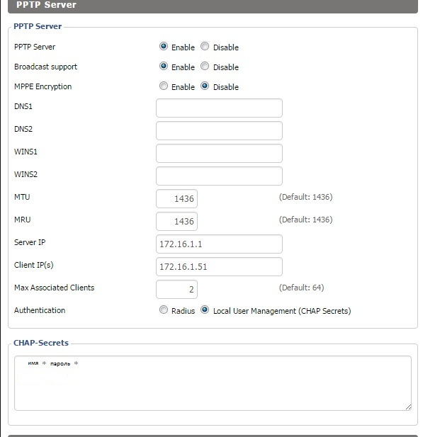 Если у вас, так же как у меня, роутер на базе Atheros AR7240, то возможно клиент VPN будет при подключении оставаться со своим локальным IP (не принимая ip из диапазона сервера). В этом случае необходимо добавить noipdefault в поле мппе шифрование. Также не лишним будет добавить –nobuffer в поле ип пптп сервера через пробел для выкл. буферизации.